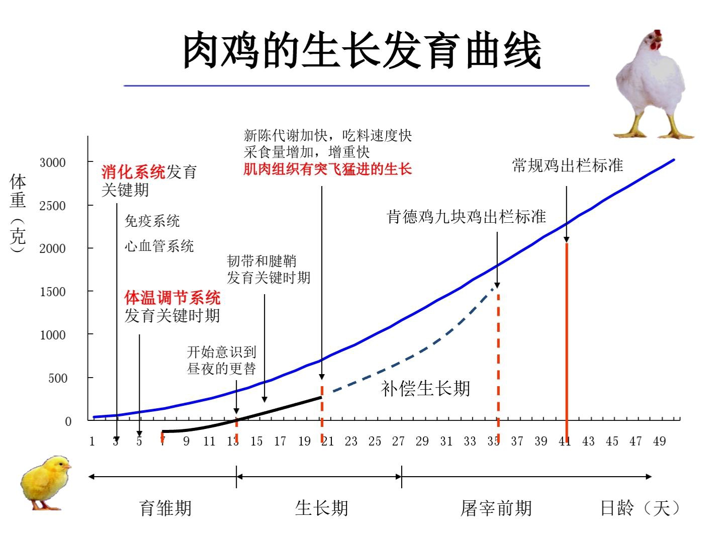 ---發揮出肉雞的最佳生產性能 1. 0~7日齡快速生長 7日齡體重要求達到出殼重量的4~4.5倍。這就要求及時開食、飲水,給雛雞創造適宜的溫度、濕度和通風環境。實踐證明,1周齡的體重達標情況對于肉雞的生長性能至關重要。7日齡相差1克=屠宰體重相差6.7克。 刺激食欲的重要性:剛出殼的小雞分不清飼料和墊料,早期采食完全出于好奇,只有在此階段才能培育食欲。雛雞采食飼料后,刺激腸道消化吸收進入血液到大腦食欲中樞產生食欲。食欲好的雞以后可以主動采食,否則采食量低,生長緩慢,所以采食很重要! 2. 8~26日齡控制生長速度 8~26日齡控制生長速度可有效地控制腿病、腹水癥、猝死癥的發生。21日齡體重最好控制在標準的下限,不能超過10%,體重控制可使前期體重略小于標準體重,但后期會有生長補償,不會對整體體重造成太大影響,可顯著提高成活率和飼料轉化率。