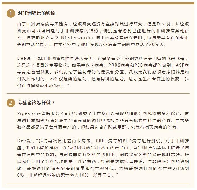 在全價(jià)飼料中,PFDV和塞內(nèi)卡病毒存活下來(lái);而PRRSV無(wú)法存活。為了總結(jié)這項(xiàng)研究,他們給豬飼喂了全價(jià)飼料,以表明PEDV和塞內(nèi)卡病毒在運(yùn)輸后仍然存活,而吃了這種飼料的豬果然生病了。Pipestone獸醫(yī)服務(wù)機(jī)構(gòu)發(fā)現(xiàn),這項(xiàng)研究是真實(shí)的證據(jù),表明飼料可能是病毒傳播的一個(gè)重大風(fēng)險(xiǎn),生產(chǎn)者需要關(guān)注飼料方面的生物安全。