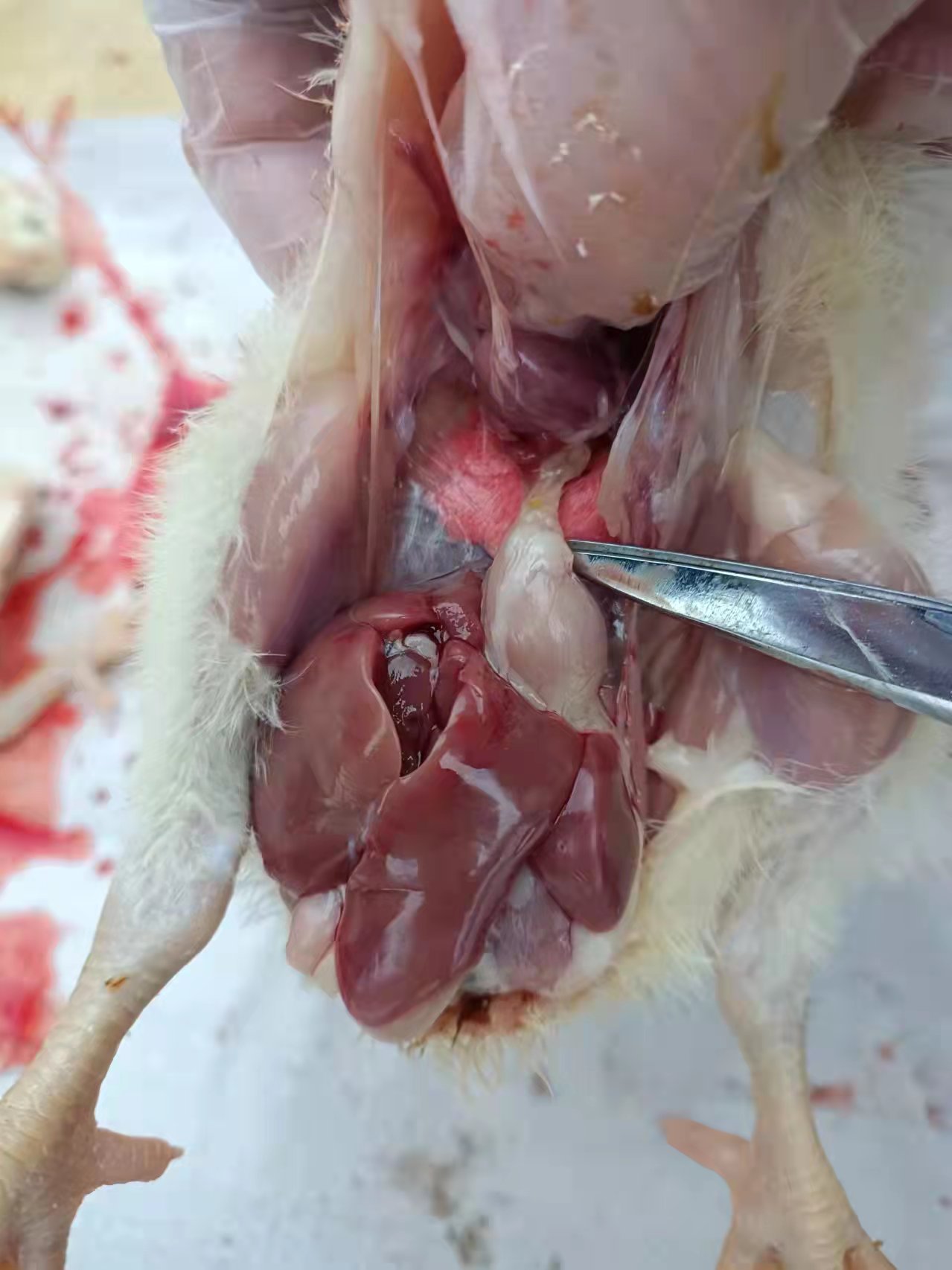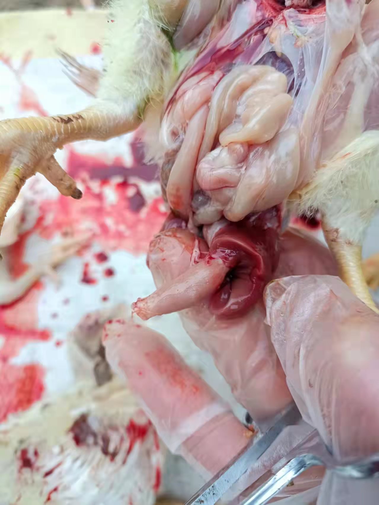 氣管透明,肺和氣囊正常,腺胃腫脹,肌胃有潰瘍,腸道基本正常。