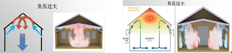 很多時候鴨群發病都是在跑風漏氣的地方開始的,密閉舍要求關閉所有進氣口(小窗、水簾處、及大門),打開一個50風機,負壓值>37.5pa。如壓力顯示為25pa,則表示棚舍約有1.5平方米的漏風面積。如壓力顯示為12.5pa,則表示棚舍約有2.3平方米的漏風面積。