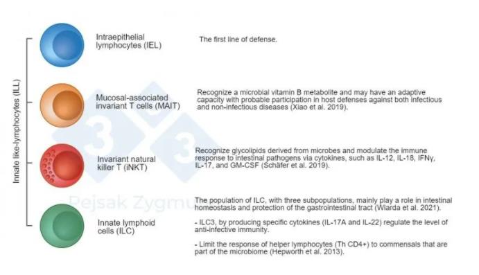 圖2. 在GALT中,我們可以區(qū)分出幾個關(guān)鍵的群體:先天類淋巴細胞(ILL)位于小腸,在較小程度上位于大腸,作為細胞因子、細胞毒分子和抗菌肽的生產(chǎn)者發(fā)揮重要作用(Hepworth et al., 2013;Sch?fer等,2019;Wiarda等人,2020;Wiarda等人,2021;肖等人,2019) 當免疫系統(tǒng)細胞識別病原體時,就會觸發(fā)免疫反應(yīng),病原體會導致促炎細胞因子、TGF β和其他介質(zhì)迅速釋放到周圍的組織和血液中。細胞因子向效應(yīng)細胞提供感染部位的信息,效應(yīng)細胞幫助清除病原體。 與動物環(huán)境相關(guān)的應(yīng)激,由于IL-10的上調(diào),導致腸道屏障受損,引起腸道免疫反應(yīng)的免疫抑制(Li et al.,2017),從而降低生產(chǎn)效率,增加疾病發(fā)病率(Peng et al.,2021)。 免疫應(yīng)激被定義為動物機體的長期免疫動員,與抵御來自不利環(huán)境條件(包括病原體)的持續(xù)應(yīng)激有關(guān)。長期免疫應(yīng)激對動物發(fā)育的負面影響,包括較高的發(fā)病率和死亡率,飼料轉(zhuǎn)化率(FCR)的降低,以及同年齡豬組之間的體重差異,其相關(guān)機制仍不完全了解。然而,眾所周知,先天免疫系統(tǒng)是宿主抗感染防御的第一道防線的一部分。表皮和粘膜上皮的屏障構(gòu)成了對致病因素的第一道屏障。 當病原體致病性強或大量存在時,或當屏障被破壞時,就有可能打破這些屏障并感染宿主。打破這種屏障的微生物通過來自細菌、病毒、真菌和原生動物的toll樣受體(TLRs)的病原體相關(guān)分子模式(PAMPs)被免疫系統(tǒng)細胞識別。TLRs在巨噬細胞、樹突狀細胞、肥大細胞、NK細胞以及T和B淋巴細胞上表達,可將病原體與死亡和失活(碎片)元素區(qū)分開來(Mair et al.,2014)。TLRs的激活是激活先天和獲得性免疫反應(yīng)的關(guān)鍵信號,并伴隨著免疫細胞的大量增殖和免疫球蛋白、細胞因子、趨化因子、急性期蛋白和許多其他物質(zhì)的產(chǎn)生對抗病原體。