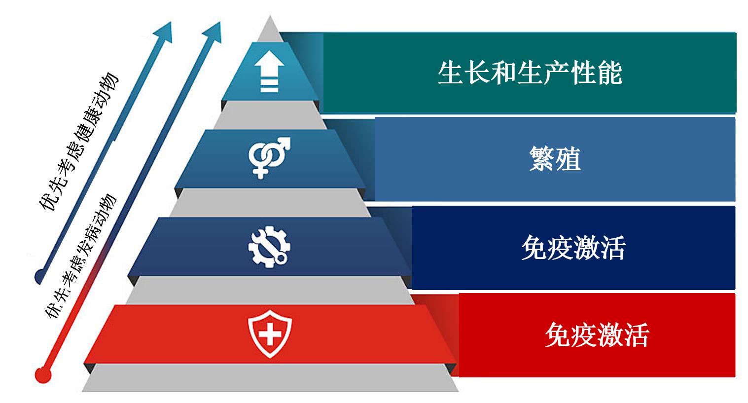 在沒有主動免疫反應的情況下,家畜和家禽根據特定動物的生長和生產性能需要對營養物質的使用進行分級。從基本功能(維持)開始,動物將按等級順序利用可用的能量和營養物質,直到耗盡。當采食量減少時,消耗的營養物質也會減少。反過來,營養物質用于維持功能,這意味著飼料不容易轉化為產出發展,無論是繁殖,蛋白質增加,產奶量,產蛋量或其他。