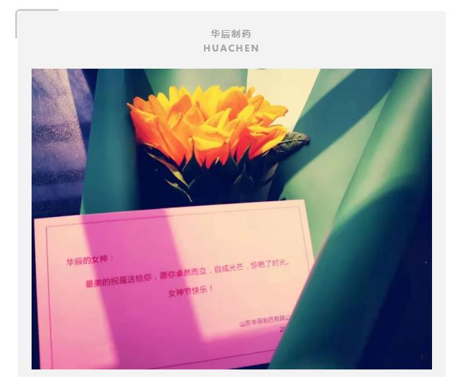 三月春風里的第一個節日雖然上班日但是,今天在華辰制藥你一定會過的溫柔且浪漫有愛的華辰精心為每一位女神送上愛的surprise綻放的向日葵沐浴著溫柔的陽光騎士們帶著禮品恭迎女神們...春風和煦,陽光滿溢,襯托著今天女神們的笑容,燦爛美麗~...
